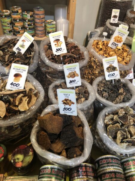 △こちらはチャーガ(手前)。以前ご紹介しましたが、民間療法ではロシアでも日本でも、さまざまな効用が語られてきました。主に白樺に寄生するきのこで、かつては白樺の栄養分を奪う“白樺の癌”と恐れられていましたが、研究が進むにつれ「幻のきのこ」と呼ばれるようになりました。