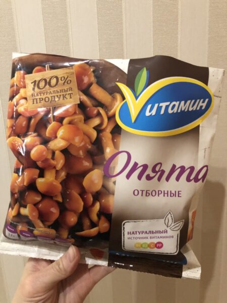 △冷凍食品コーナーでは、なめこのようにぬめりのあるナラタケ(Опята)や、黄色が綺麗なアンズタケ(Лисички)など。