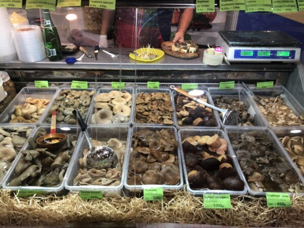 △市場やお惣菜コーナーには、塩漬けきのこがずらり。つぎつぎに味見させてくれるので、お好みのきのこを量り売りで購入でき、ポルチーニ(Белые грибы)をはじめ、乳茸(Грузди)、ヌメリイグチ(Маслята)など種類も豊富です。「ウォッカには、これがなくちゃね。」隣に並んでいた男性が嬉しそうに教えてくれました。
