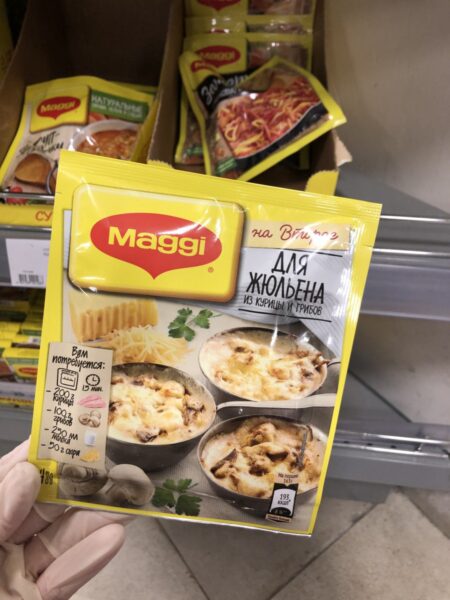 △ロシアのきのこ料理で、私のおすすめは、きのこのグラタンЖюльен(ジュリエン)。日本でもおなじみのマギーのブイヨンですが、ロシアには「簡単ボルシチ」や「簡単ジュリエン」の素も売られています。