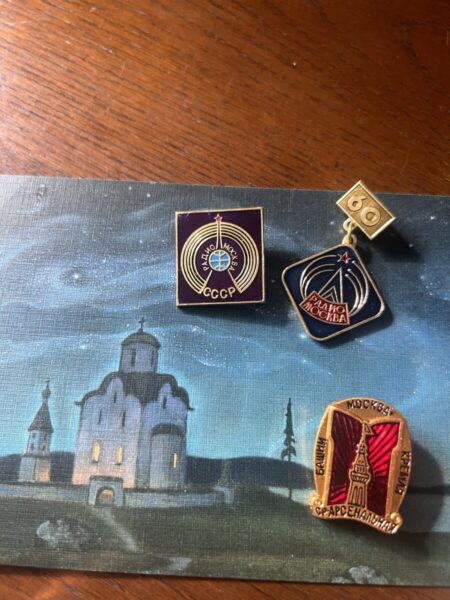 ソ連時代のピンバッジや絵葉書が参列者に手渡され、