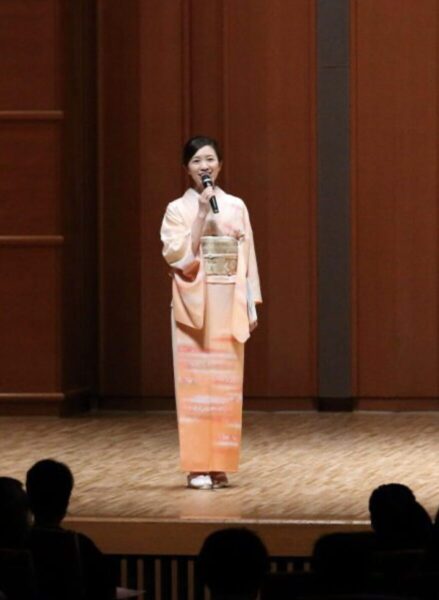 アイボリーと朱赤の着物を選び、声で舞台を彩りました。